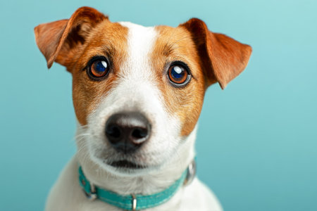 A playful brown and white dog with large, expressive eyes looks curiously at the viewer in a light setting.