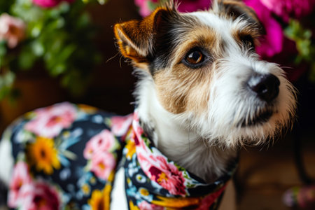 Dog wearing a bandana in spring garden. Generative AI illustration