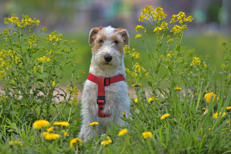 Funny Jack Russell Terrier dog run in a green blooming meadow in the season spring