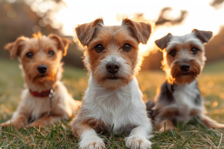 Portrait of a group of Jack Russell dogs in summer on a green lawn.