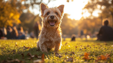 Happy Small Dog Enjoying a Sunny Afternoon in a Park Surrounded by Colorful Autumn Leaves and People Relaxing Nearby. Generative AI