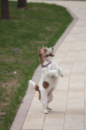 Jack Russell Terrier Puppy standing on its hind legs. fun walk outdoors