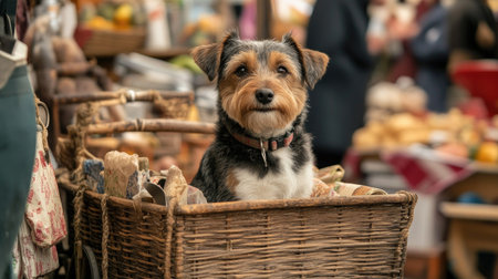 A small dog sitting in a rustic cart at a countryside fair, surrounded by handcrafted goods and food stalls