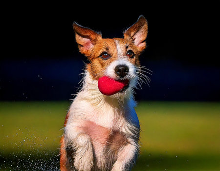 A joyful dog is captured in mid-air, showing its energy and fun in a well-lit setting.