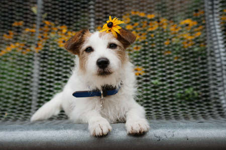 Portrait jack russell dog spring with a daisy orange flower sitting and looking at camera