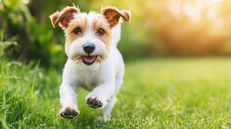 funny small Jack Russell Terrier dog is running in a green meadow in the spring season
