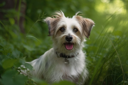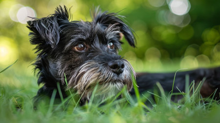Yorkshire Terrier enjoying a beautiful day in nature. A charming Yorkie doggy is captured outdoors, gazing upwards with curiosity. The dog is surrounded by lush greenery, a serene and natural setting.