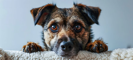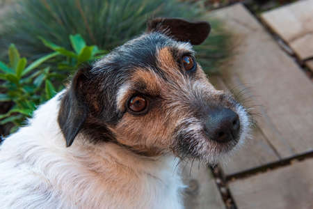 Funny closeup dog face. Dog with a suspicious face. Hairy dog. Mongrel dog. Funny memes.