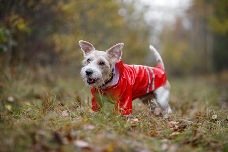 Dog breed Jack Russell Terrier stands in a green forest in a red raincoat.