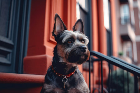 portrait of Scottish terrier dog in the city. concept of veterinary medicine, goods for dogs, dog training, dog handler, dog walking. generative AI