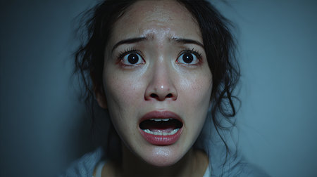 A close-up of a terrified woman screaming, her face and hands showing intense fear and panic, conveying a dramatic horror scene.