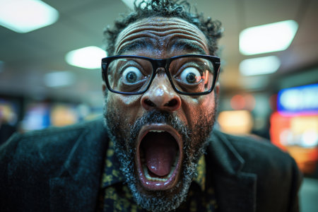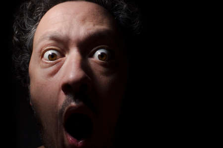 A close-up portrait of a surprised person with wide eyes and an open mouth, capturing genuine astonishment and emotion. The intense expression evokes curiosity and engagement.
