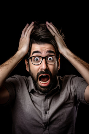 Close-up of a man with hands on his face, eyes wide in shock and fear, capturing an intense emotional reaction.