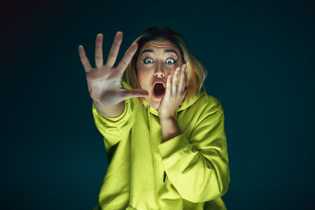 Defending. Portrait of young crazy scared and shocked caucasian woman isolated on dark background. Copyspace for ad. Bright facial expression, human emotions concept. Looking horror on TV, cinema.