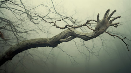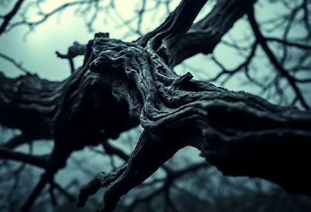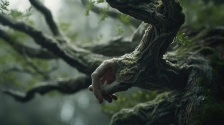 A close-up view of a gnarled tree branch in a misty forest during early morning light showcasing intricate textures and natural beauty