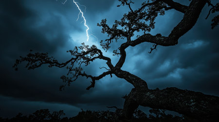 A striking depiction of nature's fury as lightning illuminates the darkened sky, silhouetting the twisted branches of an ancient tree against the stormy backdrop.