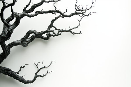 Abstract artistic image of black twisted tree branches isolated on white background, creating dramatic and minimalist contrast.