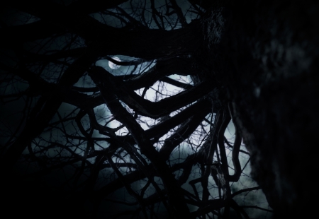 Gnarled branches intertwine overhead, forming a tangled pattern against a dimly lit sky. The atmosphere evokes a sense of mystery and enchantment in the forest.