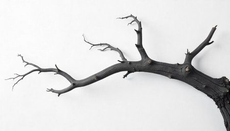 Burnt tree branch against stark white minimalist studio background