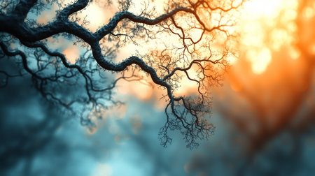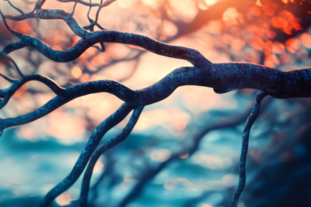 Detailed twisting tree branches silhouetted against a vibrant background of warm orange and cool blue, evoking a serene sunset scene.