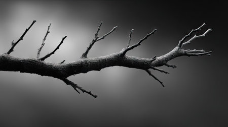 A single dry branch from a dead tree lies on a dark textured background, minimal lighting and sharp shadows for dramatic effect
