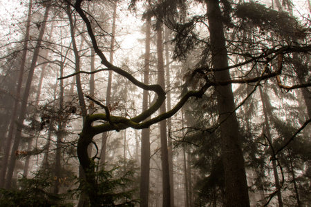 Gnarled and twisted trees creating a surreal landscape in fog