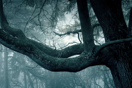 Spooky scary forest, close-up of an old tree in foggy forest