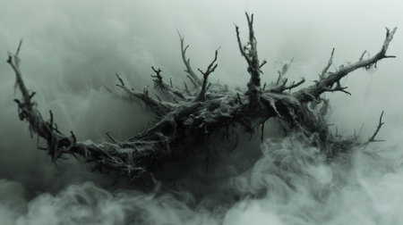 A tree is growing out of the fog in a dark area, AI