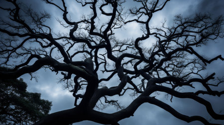 Close-up of twisted bare branches under a dark gray sky, capturing the raw and untamed beauty of nature