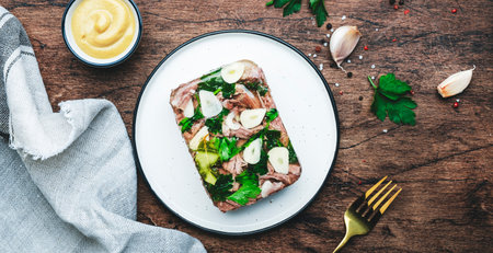 Aspic meat, cold boiled beef in spiced jelly broth on plate, Dijon mustard dressing. Old wooden rustic table background, top view