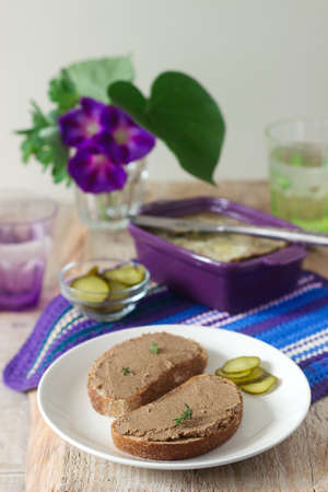 Homemade liver pate with bread and canned cucumber. Rustic style, selective focus.
