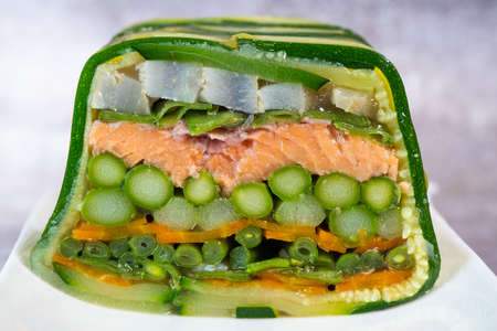 Recipe of marbled vegetables, salmon and langoustines, terrine salmon vegetables and langoustines