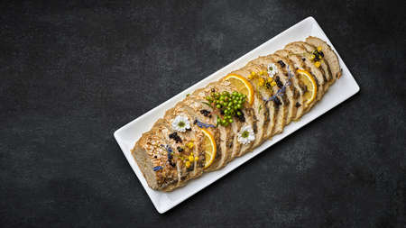 Sliced Traditional French terrine covered with bacon on dark wooden background