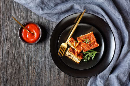 American tofu spinach vegan lasagna with champignon and tomato vegetarian bolognese served on a black plate with fork and fresh rosemary on a dark rustic wooden table with tomato sauce, top view