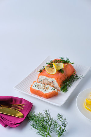 A cold appetizer, a terrine of salted salmon and smoked mackerel with cheese cream and dill, served on a white rectangular plate against a white background. Appetizers for the Easter table.