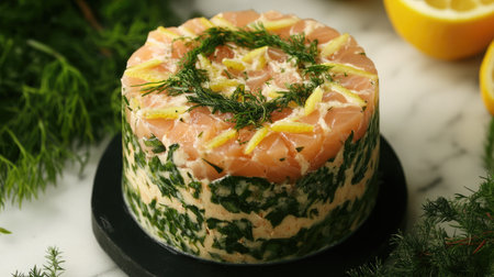 This sophisticated salmon mousse cake features fresh herbs and lemon, perfect for elegant gatherings. Ideal for canap
