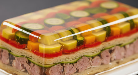Layered vegetable and meat aspic with sliced cucumbers and tomatoes