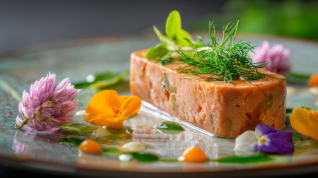 Discover a beautifully presented salmon terrine, accentuated with fresh herbs and edible flowers, ideal for gourmet cuisine, fine dining, and culinary showcases.