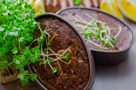 Cod liver in an iron jar on dark gray background. Space for text. Horizontal format