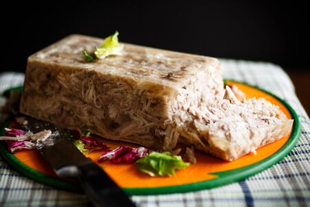 Meat jelly or meat aspic on plate. Homemade head cheese