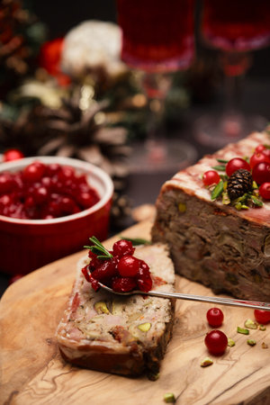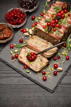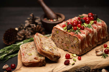 Traditional French terrine covered with bacon on dark wooden background with Christmas decorations