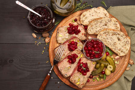 Belgian duck liver with champagne jelly, basil, butter, bread and pistachios on wooden board in domestic kitchen