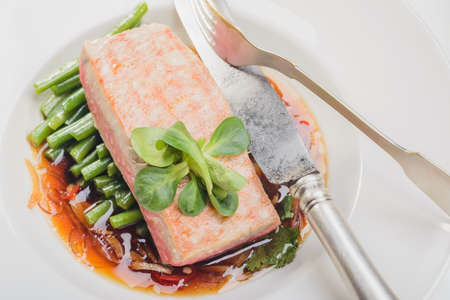 Side view on spanish dish basque baked sea bream with vegetable tartare