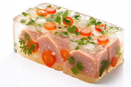 Close-up of savory aspic with meat, dill, scallions, and vegetables in golden gelatin. Ideal for editorial, culinary, heritage, or Eastern European photography themes.