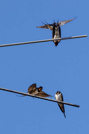 Barn Swallow, Hirundo rustica, chicks being fed.. A large group of these barn swallows foraging and hunts insects and taking their occasional rest on their turns.