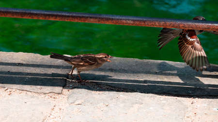 Sparrow. Ave. Brown colored sparrows flying over the Manzanares River in Madrid RÃo, a park in the city of Madrid, in Spain. Europe. Horizontal photography.