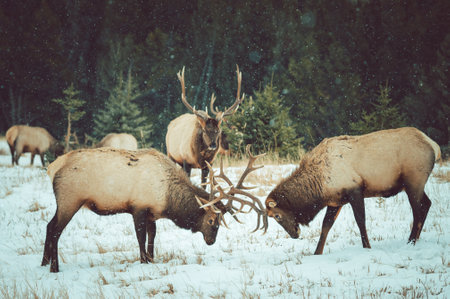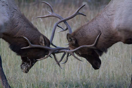 two bull elk sparing during the mating season to see who will win the hooves of the females in the herd