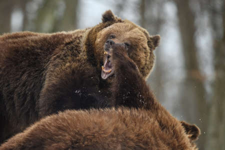 Close-up two angry brown bear fight in winter forest. Danger animal in nature habitat. Big mammal. Wildlife scene