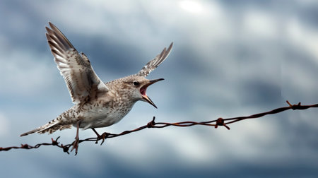 A bird is perched on a wire and is making a loud noise. The sky is cloudy and the bird is looking up. AI generated.