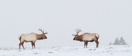Two elk face each other on a snowy landscape during winter showcasing their antlers against a foggy backdrop of trees.